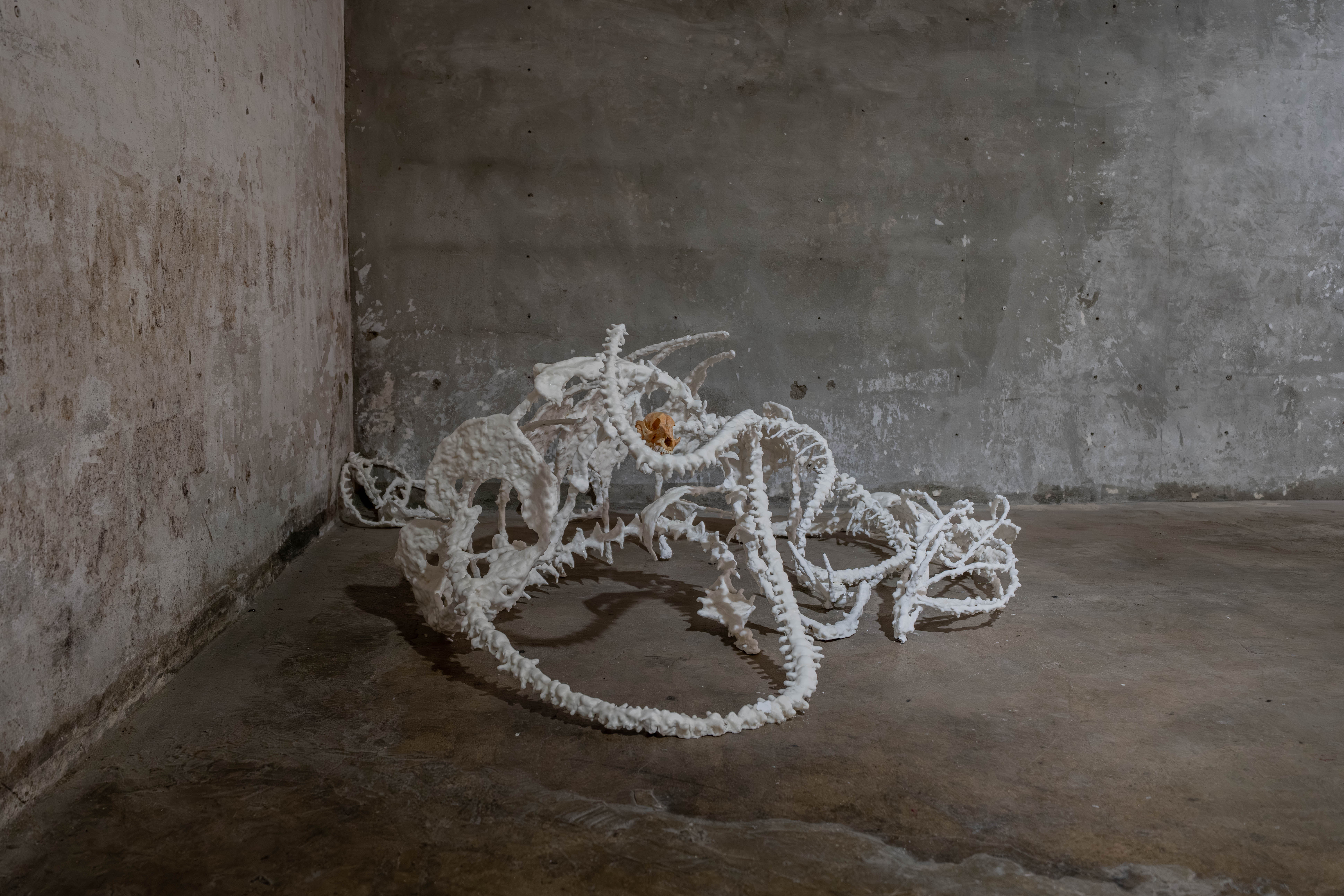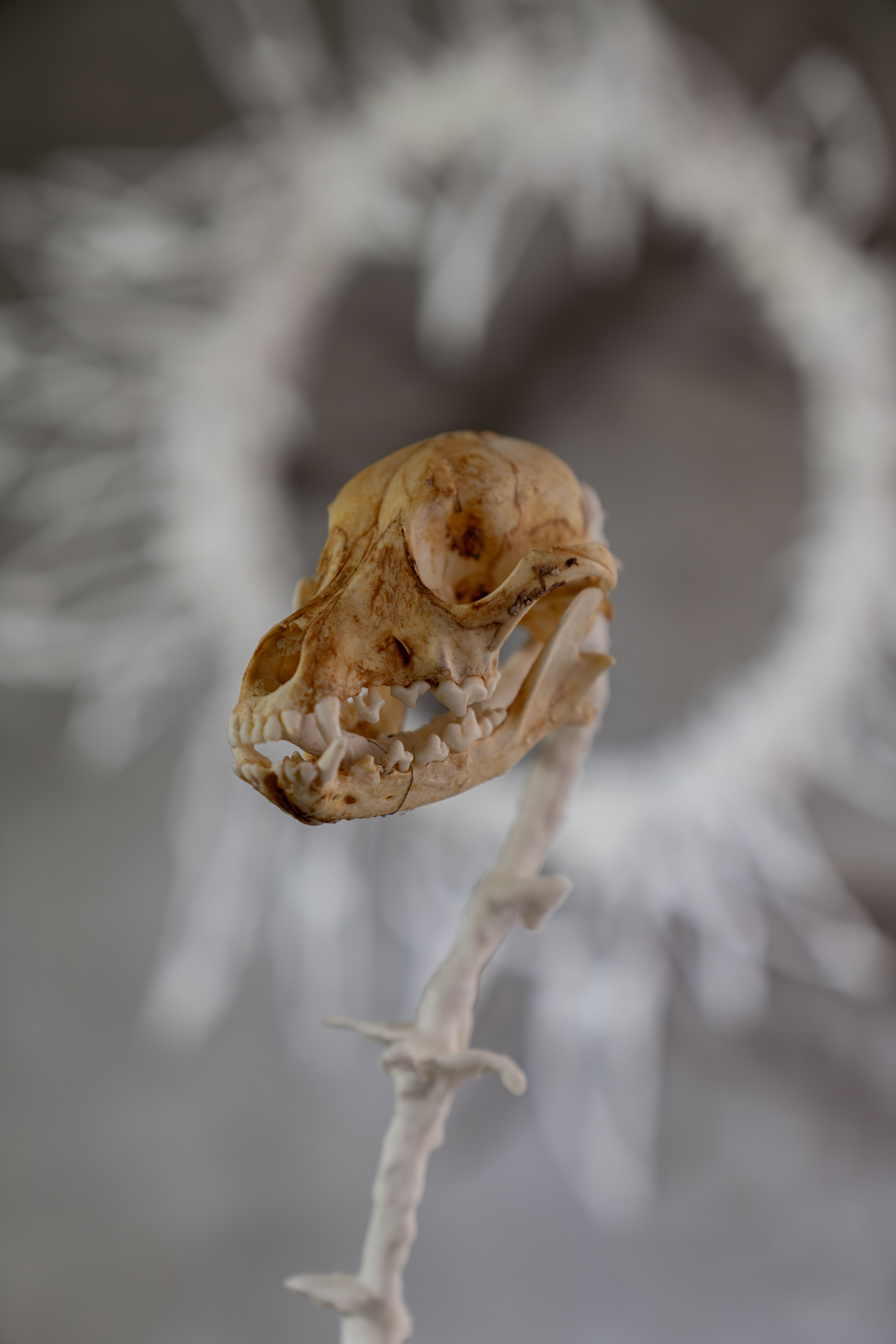 Cerberus, the multi-headed dog guarding the Underworld, inspired my exploration of shared bodies with three egos. I used three dog skulls, each with a unique body combining human, animal, and plant elements.