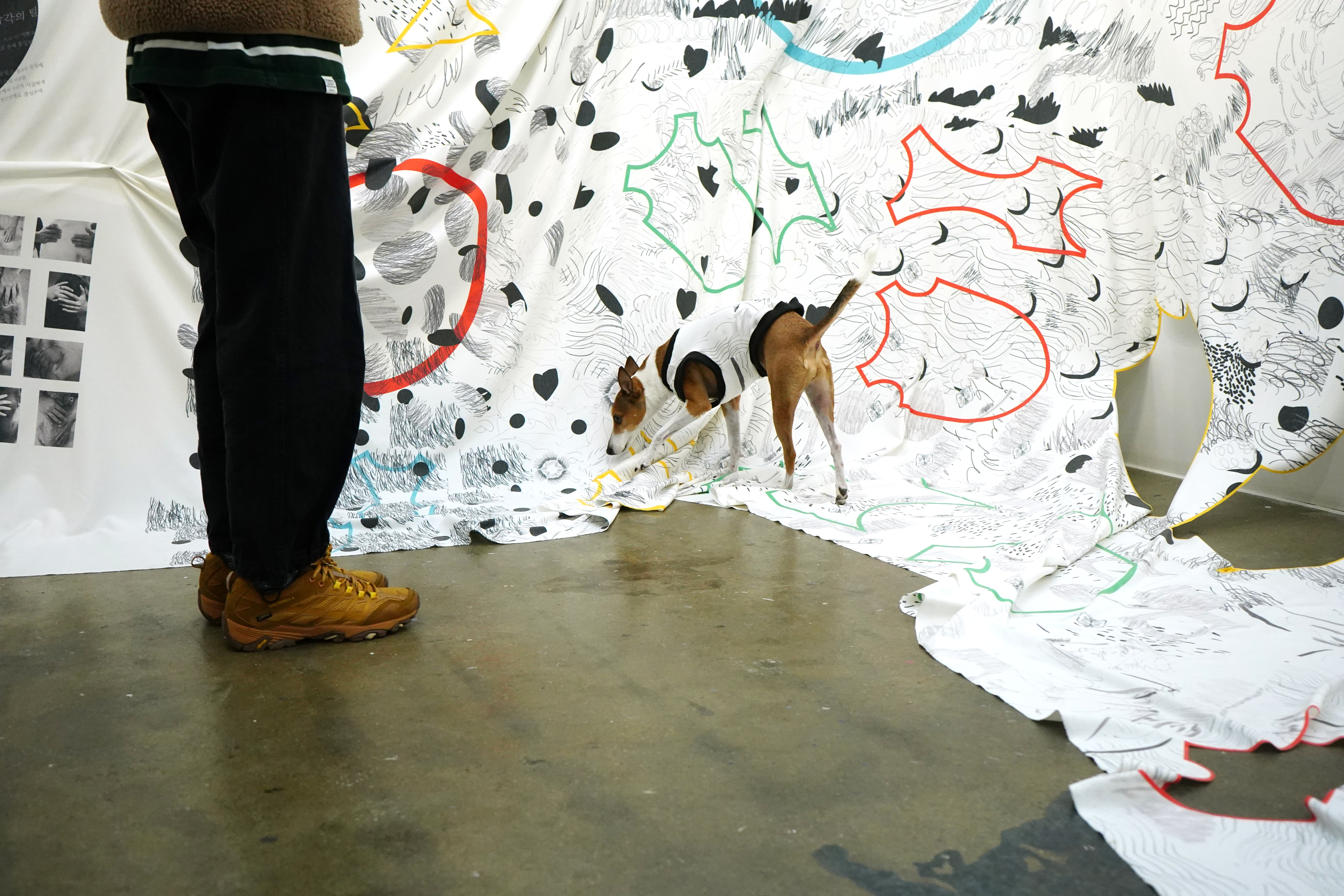 The work Loving Pattern is a piece of fabric that speaks to “the tactile experience of becoming family with a dog.” For this work, families drew “touch drawings” while recalling the experience of touching their dogs, who are members of their families. Based on these drawings, clothes and blankets were made for the dogs during the exhibition period, and they were eventually given to the families. Throughout the exhibition, the fabric needed for clothes and blankets was cut out of a large piece of fabric that occupied the gallery spaces. This process was a microcosm of the process whereby a dog transforms from a being belonging to an animal species into a particular being that is included within a family and is given a name.